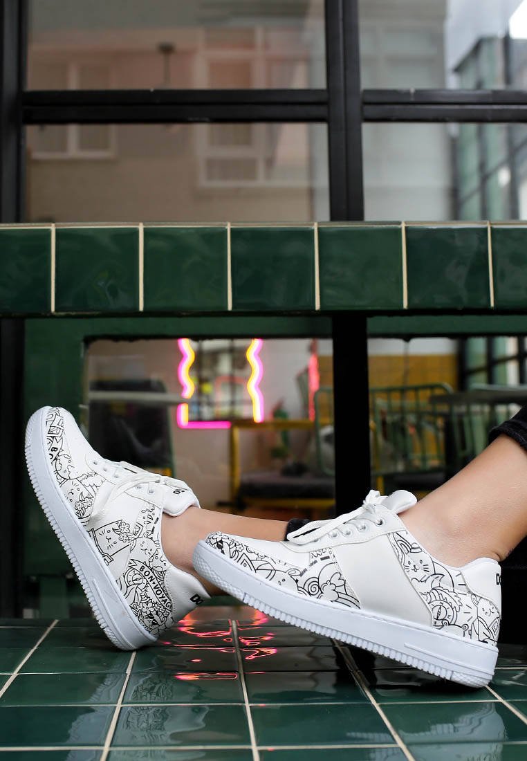 Doodle lovers here! Women's Vegan Leather Bon Voyage Design Dice White Sneakers are with you in the most linear and graphical form of creativity