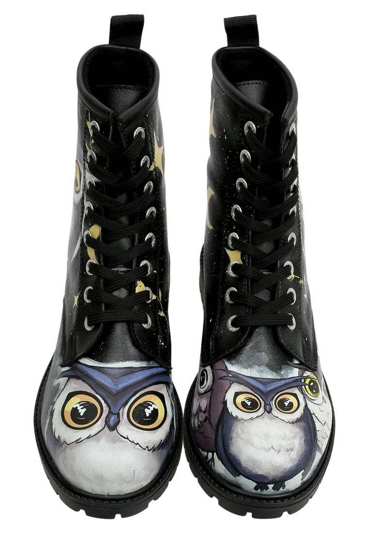 Women Vegan Leather Black Long Boots - Owls Family Design