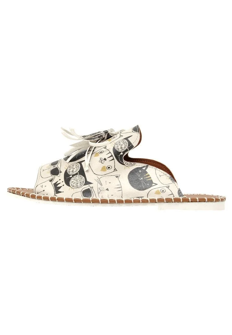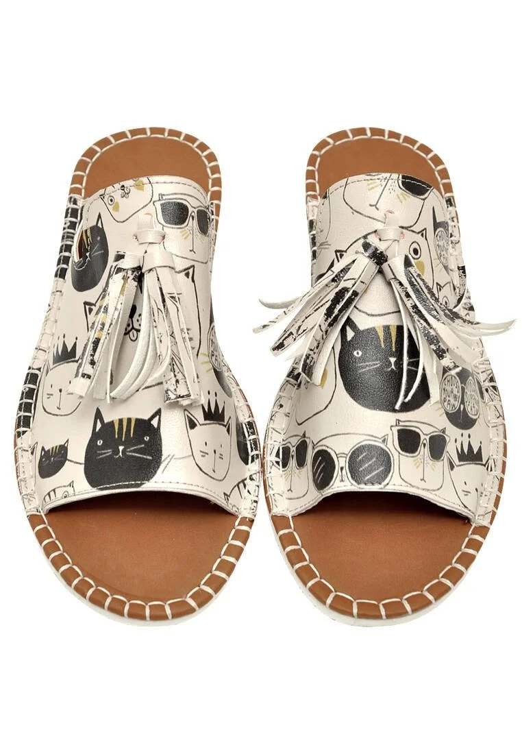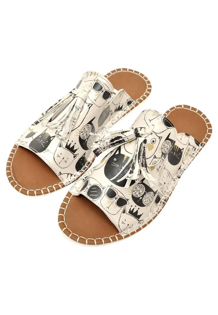 Women Vegan Leather Beige Slippers - Monochrome Cats Design