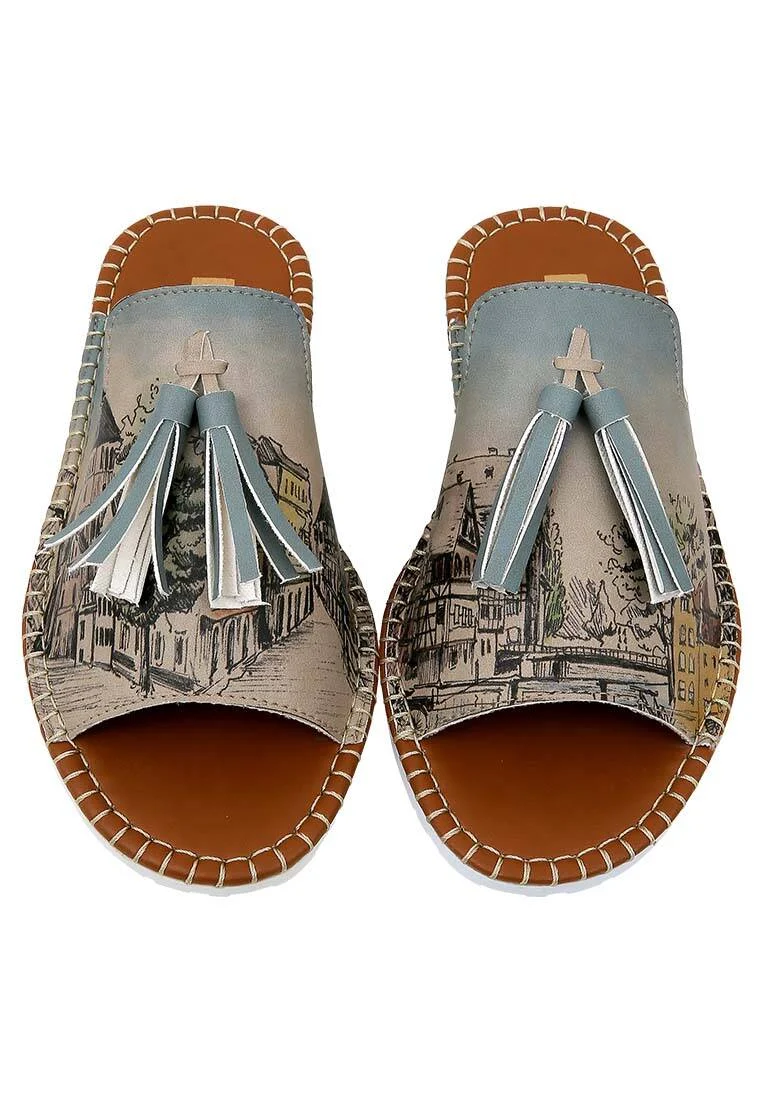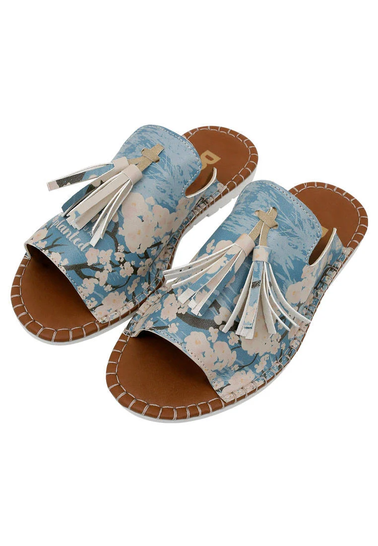 Elevate your comfort with Bloom Where You Are Planted design Women Slippers, made from high-quality Vegan Leather in a stylish blue color.